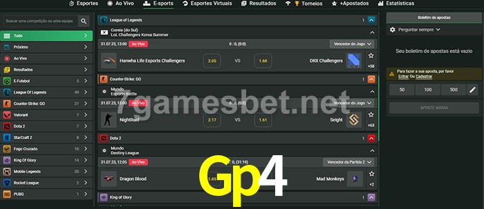O Gp4 oferece uma grande seleção de opções de apostas em e-sports com probabilidades competitivas